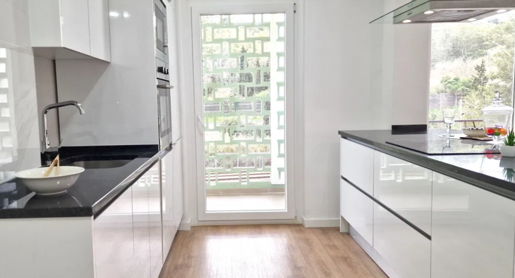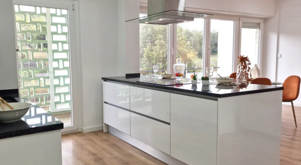 Cozinha de Sonho: Equipamento completo e encastrado (Forno, Placa, Exaustor, Micro-ondas, MLR, MLV, Termoacumulador e Combinado), com mobiliário branco e detalhes em ladrilho.